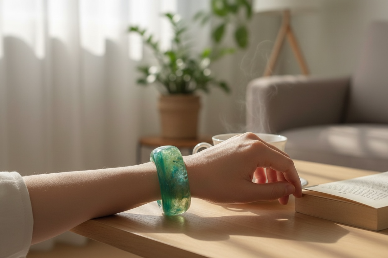 Laat je pols sprankelen met de frisse uitstraling van de Ocean Breeze Bangle. Deze brede armband heeft een transparante basis met levendige turquoise en zeegroen tinten die doen denken aan kabbelende golven en de helderblauwe zee. Het unieke marmerpatroon maakt elke armband één van een soort – een echte eye-catcher.